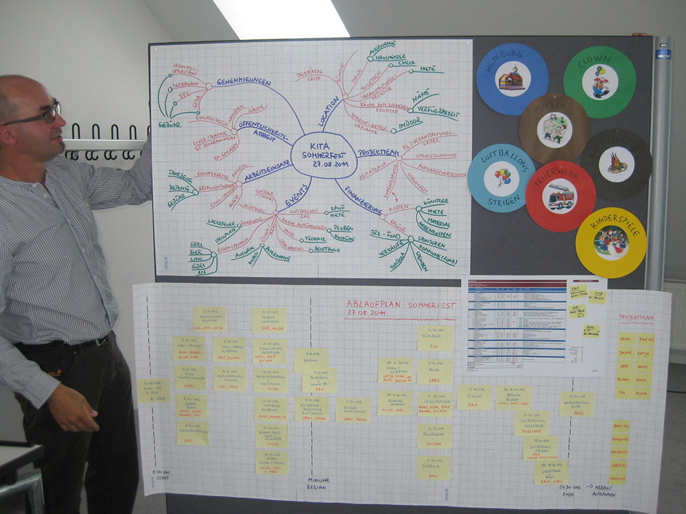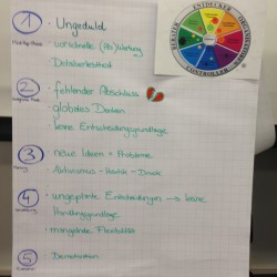 Eine zentrale Aufgabe in projektorientierten Organisationen ist die Entwicklung ausgewogener und leistungsstarker Teams, die ihre Ziele erreichen und Konflikte selbst lösen. Sehr gut dazu geeignet ist das Team Management System, entwickelt von Margerison und MacCann als Instrument der Teamführung. Mit drei Rädern – »Das Rad der Arbeitsfunktionen«, »Das Rad der Teamrollen« und »Linking Skills Rad« – decken sie alle Bereiche des Teammanagements ab. Wir erarbeiten auf Basis des TMS in mehreren Übungen ein eigenes System für das Teammanagement im Unternehmen. Welche Arbeitsfunktionen gibt es im Projekt? Was bedeuten Arbeitspräferenzen nach TMS? Was bedeuten Teamrollen und wie stelle ich das optimale Team zusammen? Wir beschäftigten uns zudem mit Gruppendynamik und diskutierten die Aufgaben des Projektmanagers in Hinblick auf die Teambildung.